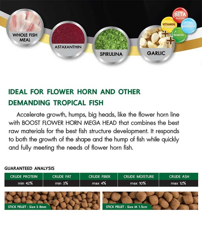 Accelerates growth, humps, big heads, like the flower horn line with BOOST FLOWER HORN MEGA HEAD that combines the best raw materials for the best fish structure development. It responds to both the growth of the shape and the hump of fish while quickly and fully meeting the needs of flower horn fish.